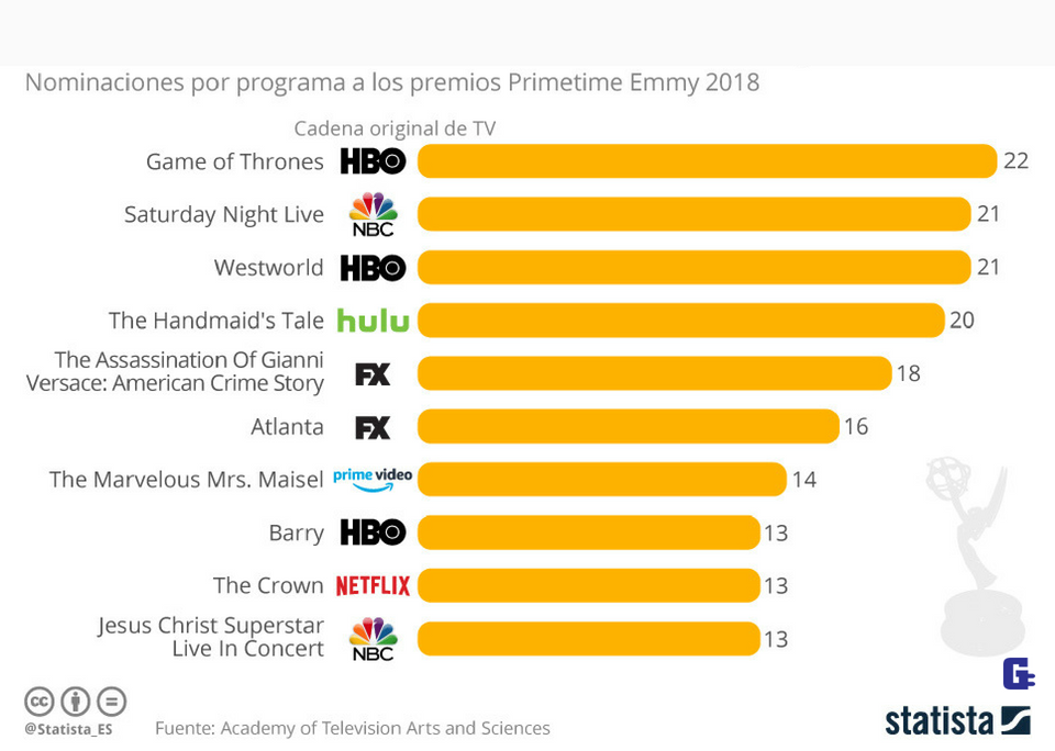 Por primera vez, la plataforma de streaming Netflix ocupa el primer puesto entre las cadenas y servicios de streaming con más series y programas nominados a los premios Primetime Emmy 2018. Así, esta, con 112 candidaturas, supera a la histórica campeona, la cadena HBO, que ha obtenido 108, tal y como se ha sabido hace unas horas. Sin embargo, tal y como se ve en este gráfico de Statista, paradojicamente ninguna producción Netflix se encuentra entre las que ha concentrado más candidaturas. Así, por ejemplo, entre las diez que optan a más premios producidas por Netflix solo aparece la serie 'The Crown', en la octava posición, con 13 candidaturas. 'Juego de Tronos' ha sido la serie más nominada con 22 candidaturas.