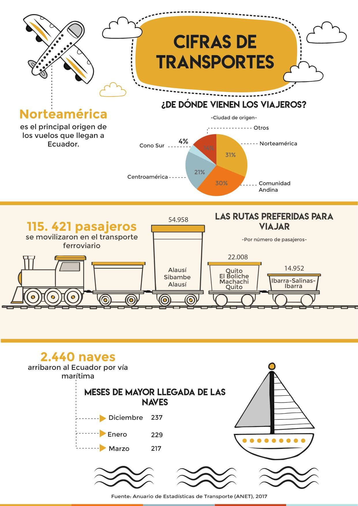 En cuanto al transporte aéreo, se reportó un total de 2 millones de ingresos al país; por otra parte, un total de 2 millones de pasajeros salieron del país a través de vuelos regulares y no reglares. En este caso, el aeropuerto de Quito presentó la mayor participación con el 54,6%.