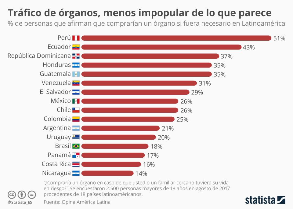 No es solo que el tráfico de órganos, es decir, el intercambio de estos por dinero, sea ilegal en la mayoría de países del mundo (con excepción de Irán), sino que también esta es una práctica vista como inmoral en prácticamente todas las culturas. Sin embargo, esto no quita para que si uno se ve en la extrema necesidad de hacerlo, se pueda plantear recurrir a ella. Así, como muestra esta infografía de Statista, en algunos países de Latinoamérica, un alto porcentaje de personas afirman que si no tuvieran otra opción para salvar la vida de un ser querido o la propia, comprarían un órgano. Así, por ejemplo, a la pregunta "¿compraría un órgano en caso de que usted o un familiar cercano tuviera su vida en riesgo?", un 51% de los peruanos da una respuesta positiva, siendo este el país con menos prejuicios respecto a esta práctica, según una encuesta de la plataforma Opinaaméricalatina.com.