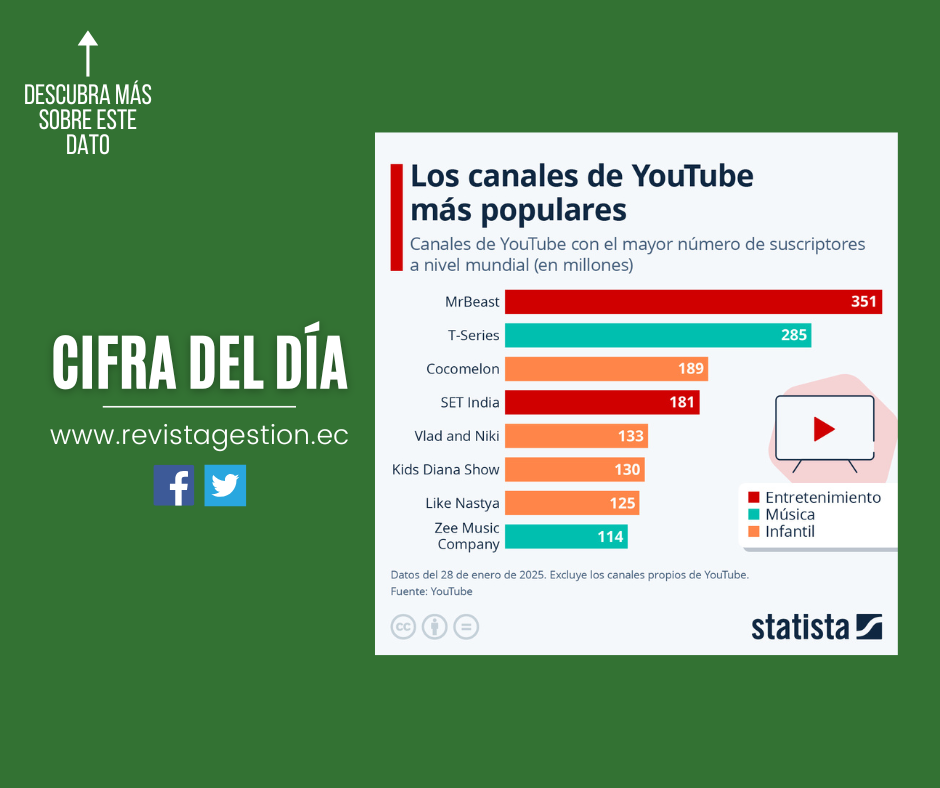 El canal MrBeast, del creador de vídeos de entretenimiento estadounidense Jimmy Donaldson, con 351 millones de suscriptores, es, con diferencia, el más popular de YouTube.