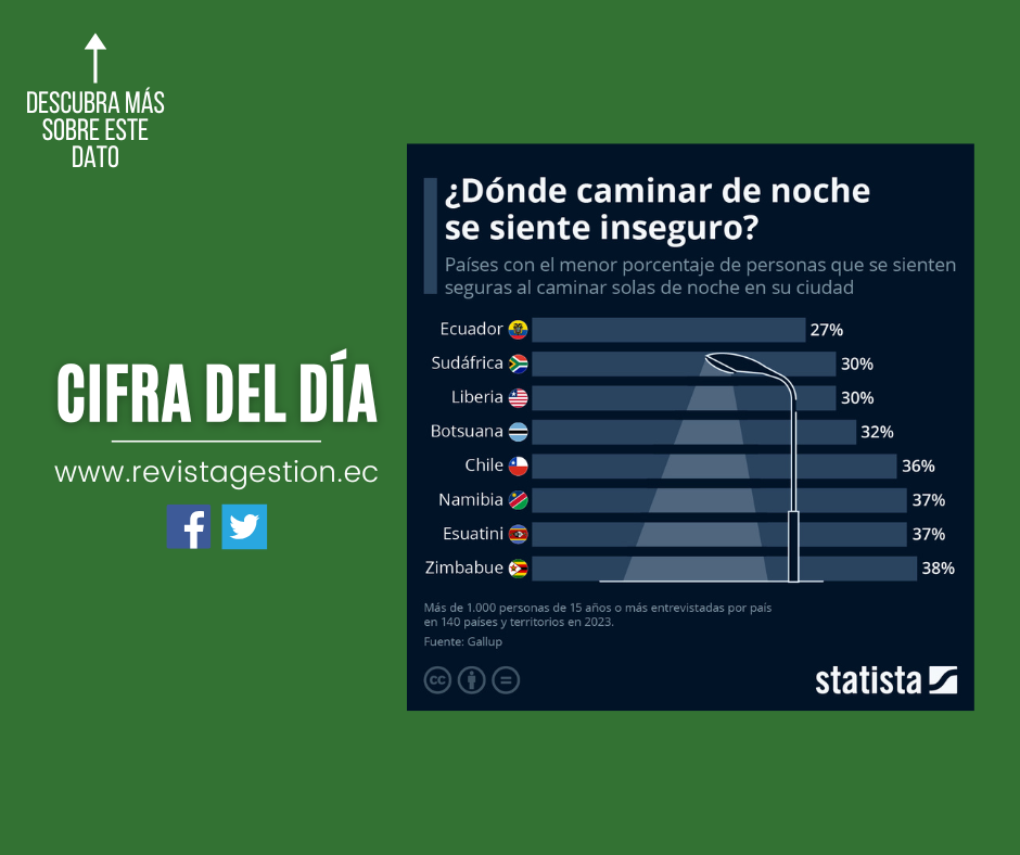 Según estudio revela que, en Ecuador sólo el 27% de los encuestados en 2023 dijo sentirse seguro caminando solo de noche en su ciudad.