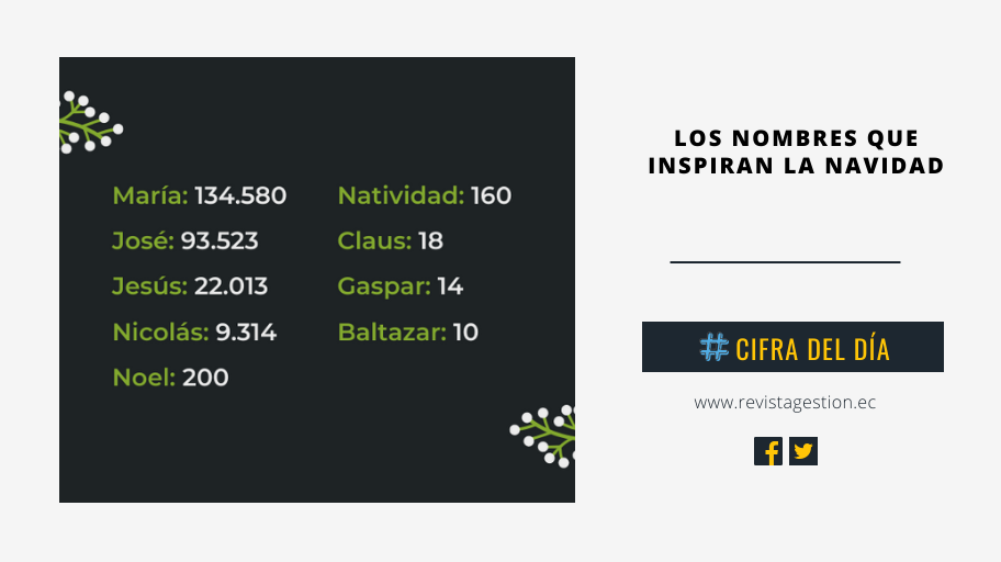 Según un estudio del INEC, los nombres que se han inspirado en la Navidad para los ecuatorianos son los siguientes: María: 134.580 José: 93.523 Jesús: 22.013 Nicolás: 9.314 Noel: 200 Natividad: …