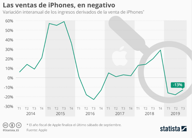 Este gráfico muestra cómo los ingresos procedentes de las ventas decrecen desde el tercer trimestre de 2018 (último trimestre fiscal de Apple), con un 16% de retroceso ese periodo respecto al mismo de …