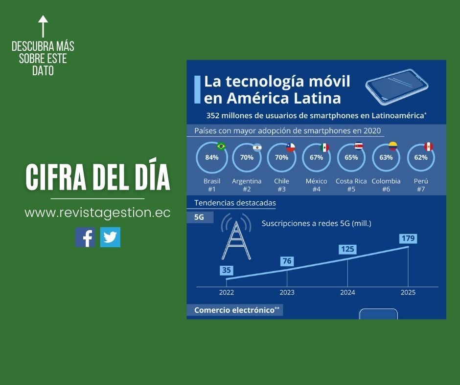 Además de la democratización del acceso a internet en los últimos años, la tecnología móvil ha sido fundamental en América Latina para permitir la continuidad de las actividades sociales y económicas durante la pandemia de COVID-19. Tal y como muestra este gráfico elaborado por Statista, la región cuenta con unos 352 millones de usuarios de smartphones, según los datos de Newzoo de 2021. Con más de ocho de cada diez conexiones móviles atribuidas a smartphones en 2020, Brasil ostenta la mayor adopción de teléfonos inteligentes de la región, seguido de Argentina y Chile, donde representa el 70%.