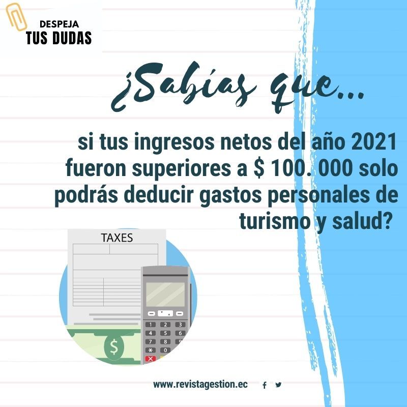 Debe presentar su anexo si sus gastos deducibles del año 2021 superaron el 50% de la fracción básica desgravada del impuesto a la renta de personas naturales ($ 5,606). Para el año 2021 la deducción de gastos personales aplica únicamente para las personas naturales con ingresos netos inferiores a $ 100.000.
