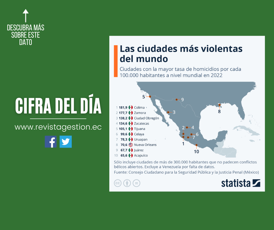 El Consejo Ciudadano para la Seguridad Pública y la Justicia Penal, una organización no gubernamental mexicana, publica todos los años un estudio sobre las 50 ciudades más violentas del mundo. Según el nuevo reporte hecho público esta semana, varias urbes situadas en México acaparan las primeras posiciones del infame ranking, al registrar las tasas de homicidios más altas entre ciudades de más de 300.000 habitantes que no padecen conflictos bélicos. Así, Colima, la ciudad capital del homónimo estado, lidera la lista con casi 182 homicidios perpetrados por cada 100.000 ciudadanos en 2022. Le sigue Zamora, la tercera mayor ciudad del estado de Michoacán, donde se registraron cerca de 178 asesinatos por cada 100.000 personas. Ciudad Obregón, ubicada en el sur de Sonora, se sitúa en el tercer lugar, con una tasa de 138 homicidios.