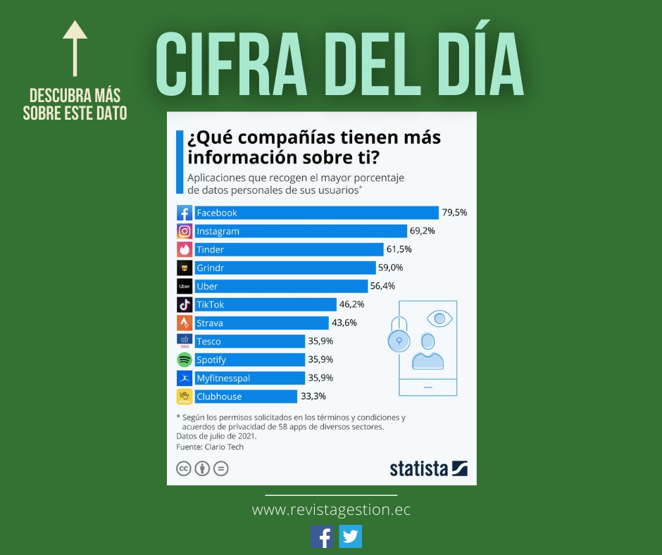 Según la edición 2021 del análisis realizado por la empresa de seguridad cibernética Clario Tech, Facebook e Instagram encabezan la lista, almacenando aproximadamente el 79,5% y el 69,2% de los datos de sus usuarios, respectivamente. Por su parte, la app de citas online Tinder ocupó el tercer lugar, al recoger 61,5% de los datos personales, seguida por la plataforma destinada a personas gay, bi, trans y queer, Grinder, que almacena hasta un 59% de los datos existentes.