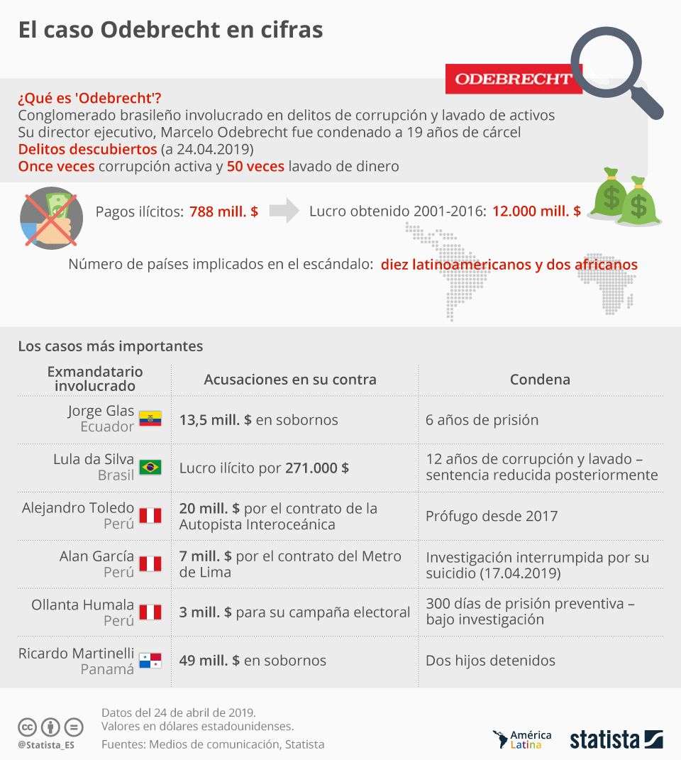 Esta infografía de Statista muestra algunos de los datos más relevantes del escándalo Odebrecht, considerado hoy el mayor caso de corrupción de la historia moderna en el continente americano. Según la investigación del Departamento de Justicia de EE. UU., la empresa brasileña pagó aproximadamente 788 millones de dólares en sobornos en doce países, de los cuales diez son latinoamericanos. De ellos, Perú es probablemente el país más afectado, ya que cuatro de sus expresidentes están acusados de delitos de corrupción, sobornos y lavado de activos en relación a Odebrecht.