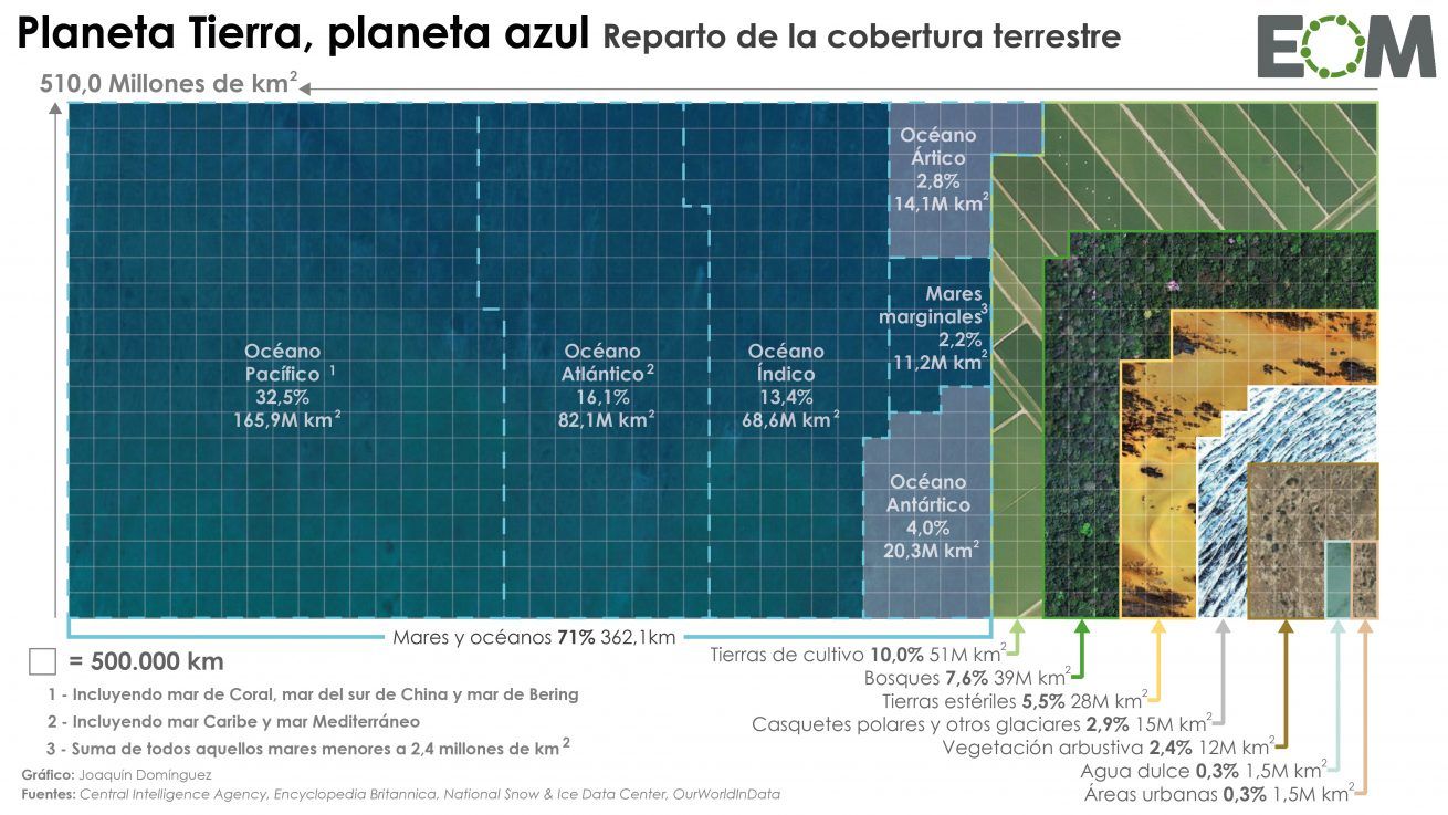 A pesar de su nombre, la Tierra está cubierta en su mayoría por agua. Casi tres cuartas partes del planeta son mares y océanos y los seres humanos sobreviven sobre poco más del 20% de la superficie total. Sin embargo el impacto humano sobre ella es inmenso, está en aumento y está alterando las proporciones.
