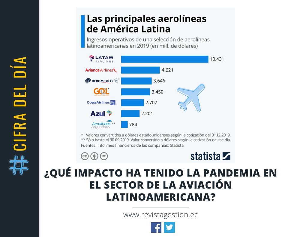 LATAM Airlines surgió en 2015 de la fusión de las principales aerolíneas de Chile (LAN) y Brasil (TAM). Con sede en Santiago de Chile, fue la compañía aérea con más ingresos de toda América Latina en 2019, superando los 10.400 millones de dólares estadounidenses. Así, LATAM llegó a facturar más del doble que Avianca, cuyos ingresos operativos rondaban los 4.600 millones de dólares, y casi tres veces los ingresos de Aeroméxico, la aerolínea de bandera de la nación azteca.