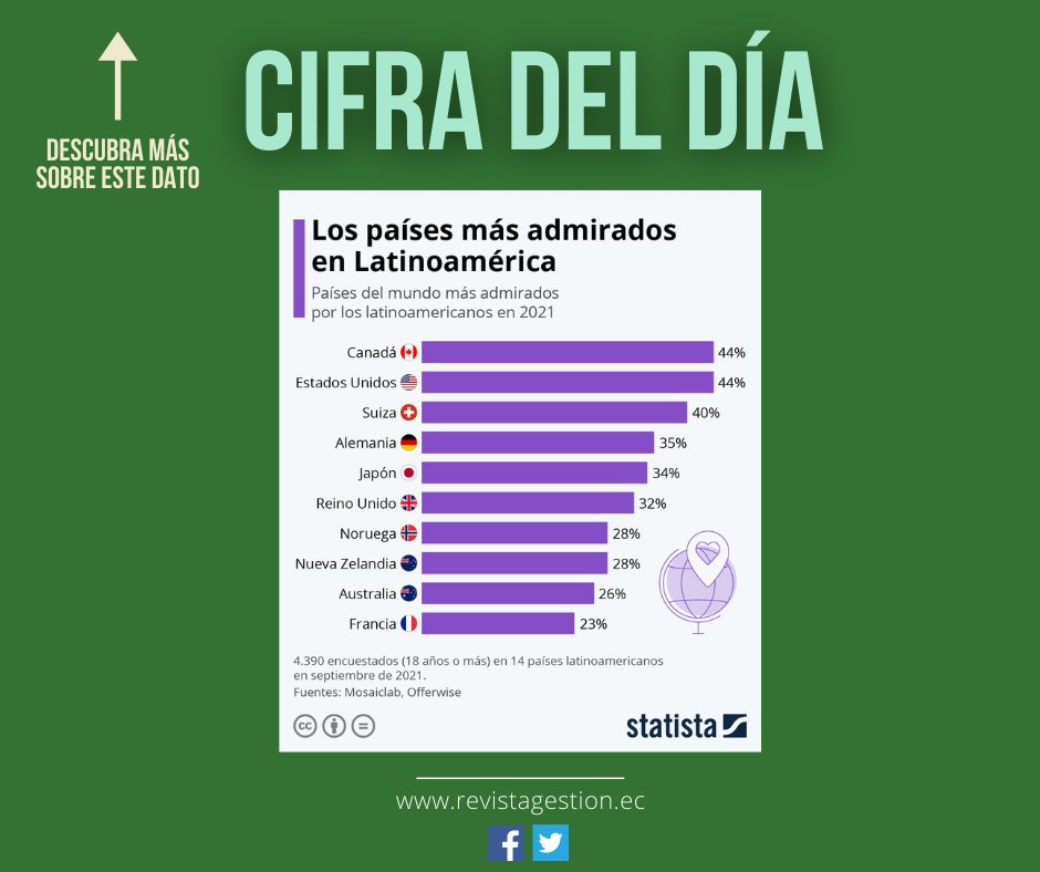 Canadá y Estados Unidos son los países que los latinoamericanos más admiran, según una encuesta realizada en septiembre de 2021 por las consultoras Mosaiclab y Offerwise. Más de cuatro de cada diez ciudadanos entrevistados en 14 países de América Latina dicen admirar a sus vecinos de Norteamérica. Aunque la percepción latinoamericana de Estados Unidos puede variar en función del gobierno de turno o la coyuntura económica, no hay dudas de que una gran parte de la población latinoamericana lo considera como un modelo a seguir.