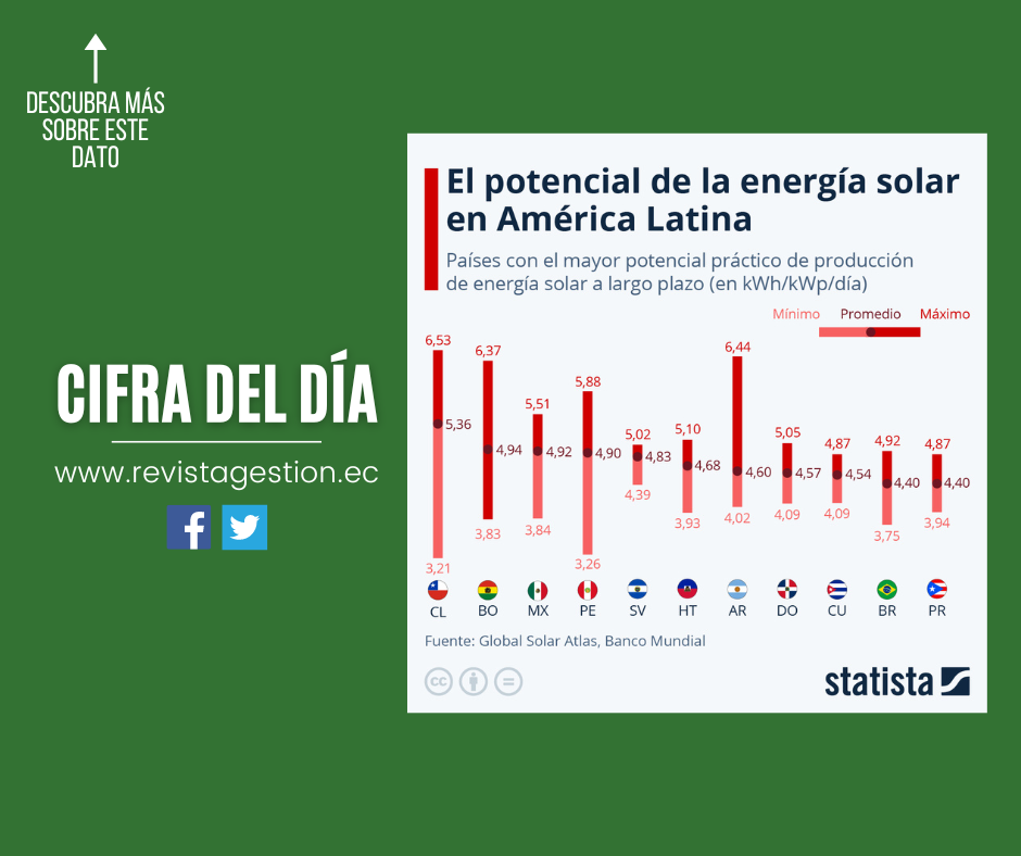 Tal y como muestra este gráfico de Statista, Chile es el primer país de la región en cuanto a rendimiento práctico de una instalación de energía solar a escala comercial, con un promedio de 5,36 kWh/kWp/día. Le siguen Bolivia, México y Perú, que superan una media diaria de 4,90 kWh/kWp. En Centroamérica, El Salvador y Guatemala se situaron a la cabeza, mientras que en el Caribe el primer puesto es para Haití, por delante de la República Dominicana y Puerto Rico.