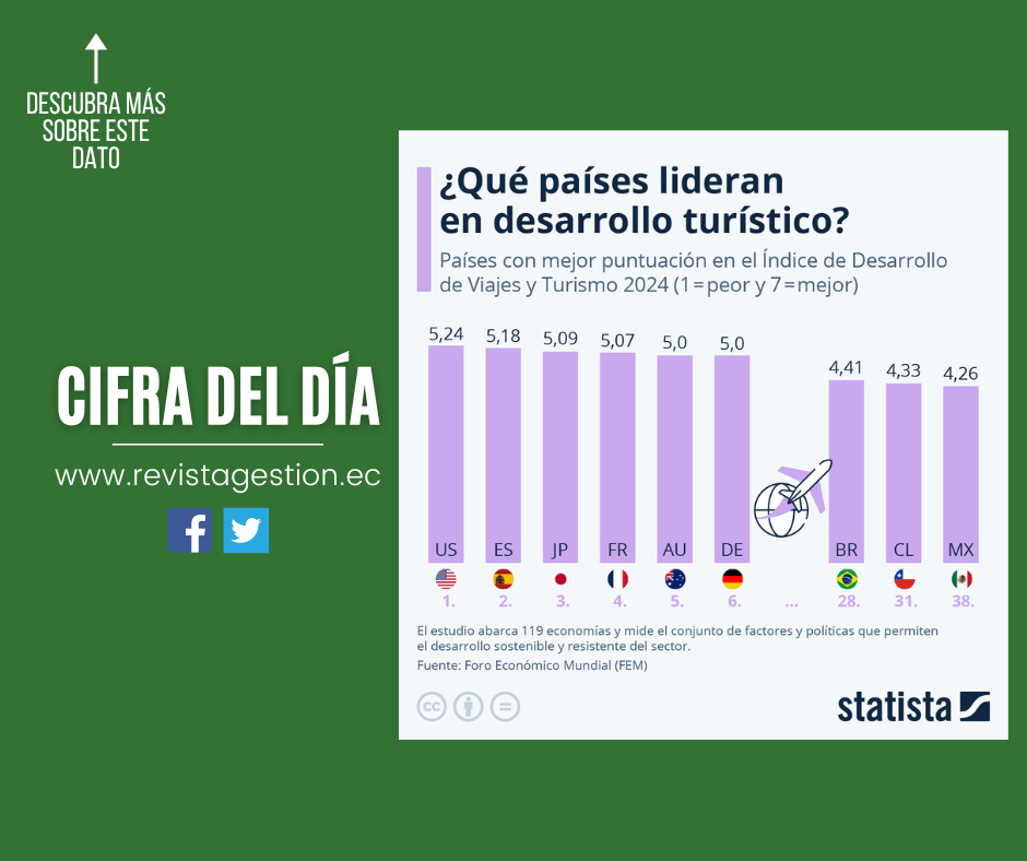 Según el TTDI, Estados Unidos alcanzó el puntaje más alto del mundo con 5.24 puntos de un máximo de siete en 2024. Como muestra nuestro gráfico, al sector del turismo estadounidense le siguieron España, Japón, Francia y Australia, completando así el top cinco de las industrias de viajes y turismo más resilientes y sostenibles del planeta.