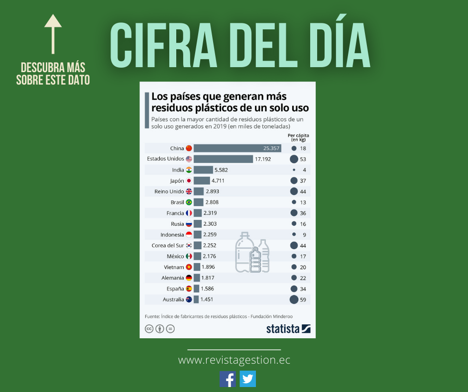 Ya en 2019, el año previo a la pandemia, más de 130 millones de toneladas de plásticos de un solo uso se tiraron en el mundo, según el Índice de fabricantes de residuos plásticos, publicado el pasado mes de mayo por la Fundación Minderoo. Entre los quince países que más residuos plásticos de un solo uso generaron ese año se encuentra España, con casi 1,6 millones de toneladas. El país también destaca por la cantidad de residuos de este tipo que produce per cápita: 34 kilos anuales. Los tres países más poblados del mundo, China, Estados Unidos y la India, encabezan este ranking, aunque la cantidad de plástico de un solo uso desechado por persona varía notablemente entre ellos. Mientras los indios apenas generaron cuatro kilos por persona en 2019, los chinos produjeron 18, y en Estados Unidos la cifra se disparó hasta alcanzar los 53 kilos de deshechos plásticos de un solo uso generados por ciudadano.