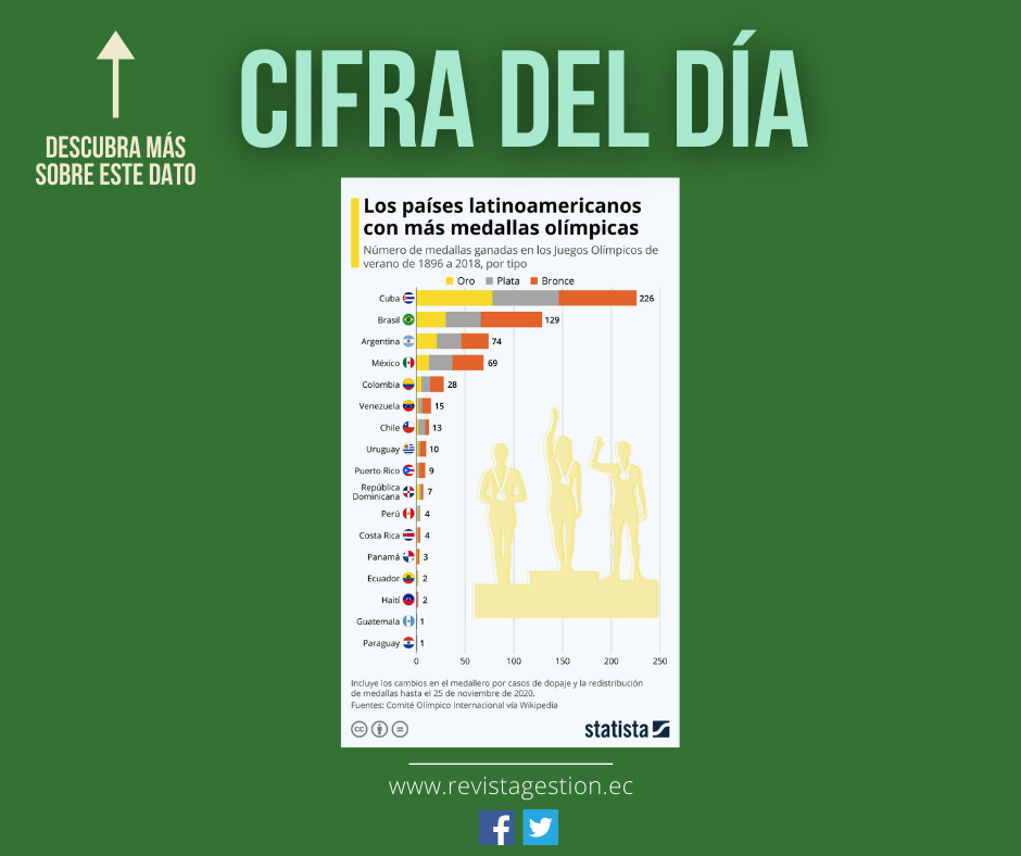 De acuerdo con los datos del Comité Olímpico Internacional (COI) recopilados por Wikipedia, Cuba domina el ranking de países con más medallas olímpicas de América Latina. Desde 1896 hasta 2018, los atletas cubanos subieron al mayor podio deportivo del mundo unas 226 veces, de las cuales 78 fueron por la obtención del más alto logro, la medalla dorada. Un honor más que meritorio, si comparamos la cantidad de población de la isla caribeña, unos 11 millones de habitantes, con un gigante como Brasil, de más de 212 millones según las estimaciones de 2020 del Banco Mundial. Justamente, el país carioca se ubica en el segundo lugar del historial latinoamericano, con 129 medallas, 30 de ellas de oro. Argentina se sitúa tercera, con 74 (21 doradas), seguida por México con 69 (13 doradas).