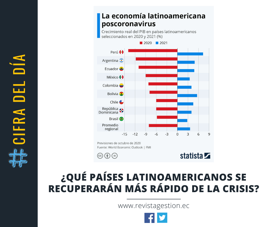 Una de las grandes incógnitas que plantea la pandemia del SARS-CoV-2 es cuánto tardarán las economías en recuperarse de varios meses de cuarentena y paralización. Según las últimas estimaciones del Fondo Monetario Internacional, hechas públicas este octubre, ninguna de las mayores economías de América Latina conseguirá evitar la recesión, por lo menos en 2020. De los países incluidos en este gráfico de Statista, Perú, Argentina y Ecuador son los que se enfrentarán al peor contexto económico, los tres con recesiones de al menos dos dígitos este año.