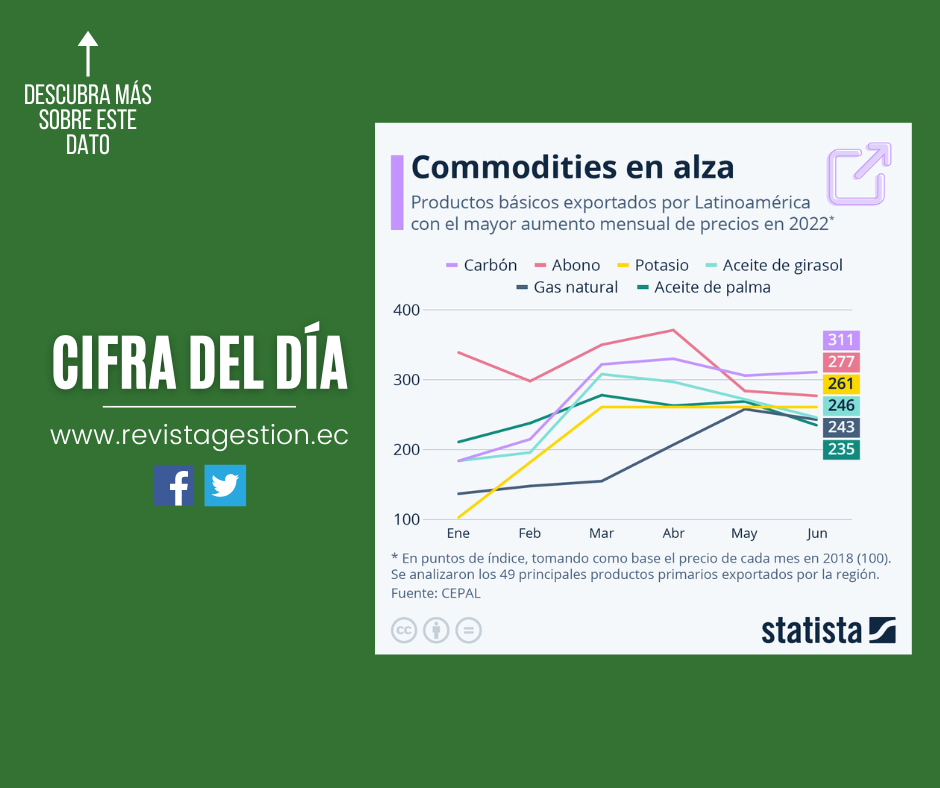Según los datos recientemente publicados por la CEPAL, el carbón, el abono para suelos y el potasio son los productos primarios cuyo precio más aumentó este año, entre aquellos en cuya producción la región se especializa. De los 49 principales productos básicos exportados por Latinoamérica bajo análisis, el carbón triplicó su precio desde marzo, llegando a un índice de 311 en junio de 2022, si lo comparamos con el precio mensual de 2018. Los fertilizantes orgánicos, a su vez, llegaron a rozar un incremento de cuatro veces el valor de 2018 en abril de este año. Otros de los commodities estrella de la oferta exportable latinoamericana cuyo precio subió más son el aceite de girasol, el gas natural y el aceite de palma, con un incremento de entre 2,3 y 2,5 veces entre junio de 2018 y junio de 2022.