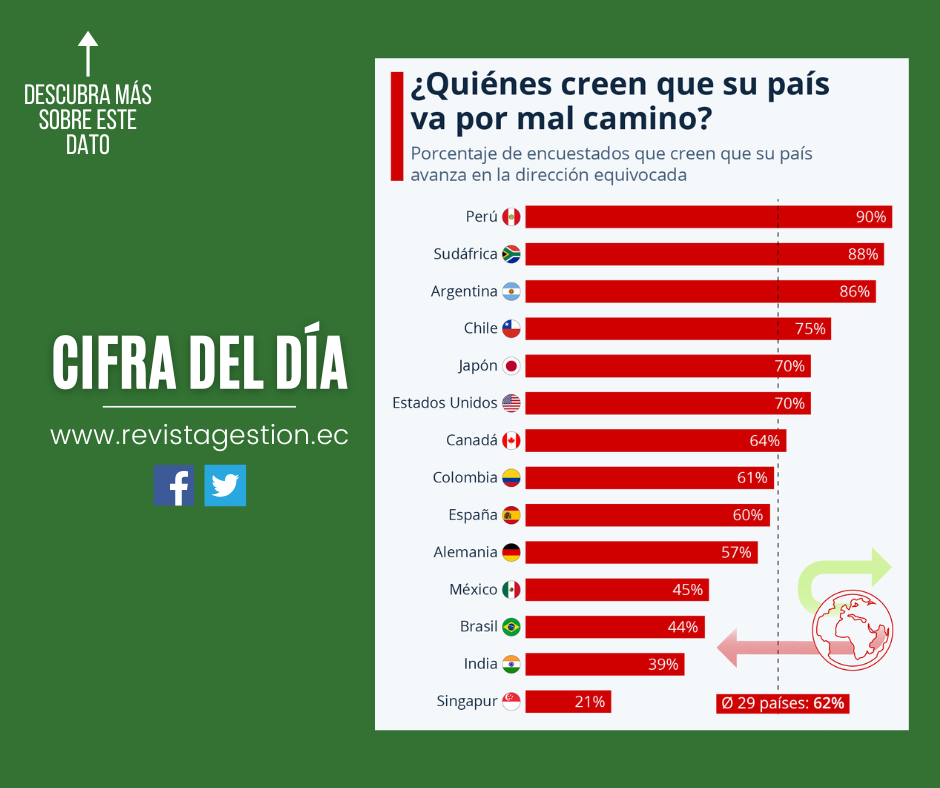 Si comparamos unos países con otros, se observa que la situación varía bastante. En ninguno de los analizados es más pronunciada la sensación de ir por mal camino que en Perú, donde nueve de cada diez encuestados son pesimistas respecto al rumbo actual del país. Cabe recordar que el país se ha visto envuelto en una gran agitación política y social, con protestas sociales, desde diciembre. Por el contrario, sólo el 21% de los entrevistados en Singapur opina que su país va por mal camino.