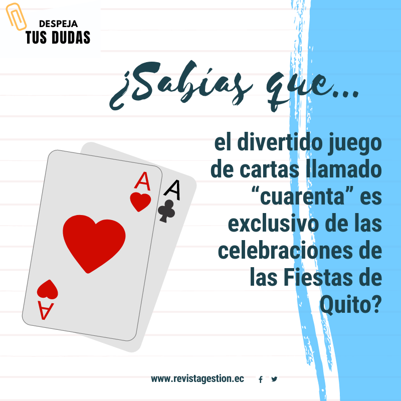 El divertido juego de cartas llamado “cuarenta” es exclusivo de las celebraciones de las Fiestas de Quito. Aunque es un juego simple, sirve muchísimo para pasar un buen rato entre amigos. Consiste en que una persona o un grupo de personas trate de adueñarse de las cartas de sus contrincantes.