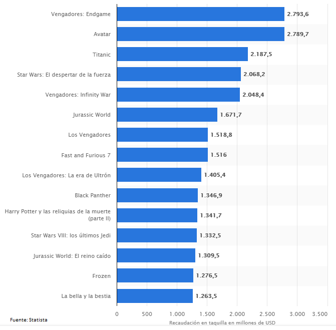Esta estadística presenta el ranking de las películas que han registrado la mayor recaudación en taquilla de la historia a nivel mundial. A fecha de 31 de julio de 2019, "Vengadores: Endgame" era el film más taquillero, seguido por "Avatar". El podio lo completó el largometraje de 1997 "Titanic", protagonizado por Leonardo DiCaprio y y Kate Winslet, con una recaudación de taquilla de aproximadamente 2.190 millones de dólares estadounidenses.