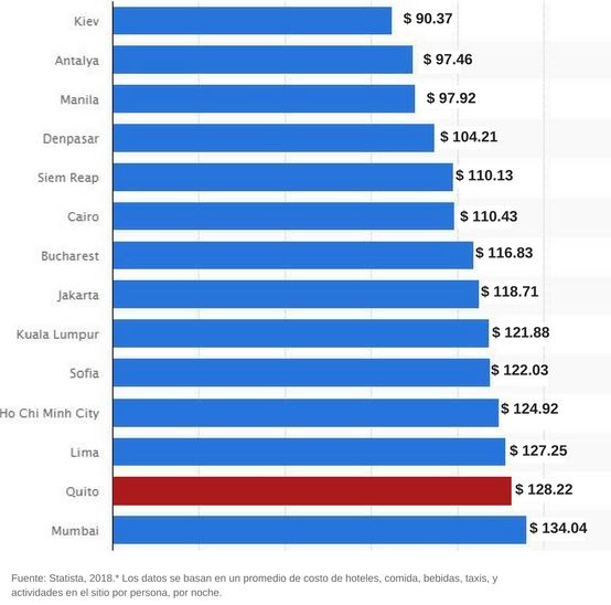 El sitio web Hoppa, realizó un ranking de los destinos más baratos en el mundo en 2018, según el precio medio por turistas por noche y por persona. Cómo se puede ver en esta infografía de Statista, Quito es una de las ciudades menos costosas para pasar las vacaciones con un promedio de $ 128 por noche por cada uno de los turistas. Aquí un cuadro con los 14 destinos más baratos para visitar estas vacaciones.