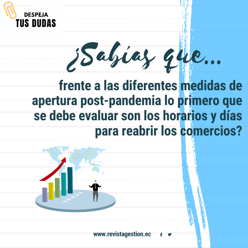 - Horarios y días: Frente a las diferentes medidas de apertura post-pandemia que han establecido las autoridades lo primero que se debe evaluar es la forma como se pueden abrir los comercios, tiendas, almacenes y fábricas y así crear un plan de trabajo que nos permita ir escalando nuestra producción según vaya ampliándose la demanda.
