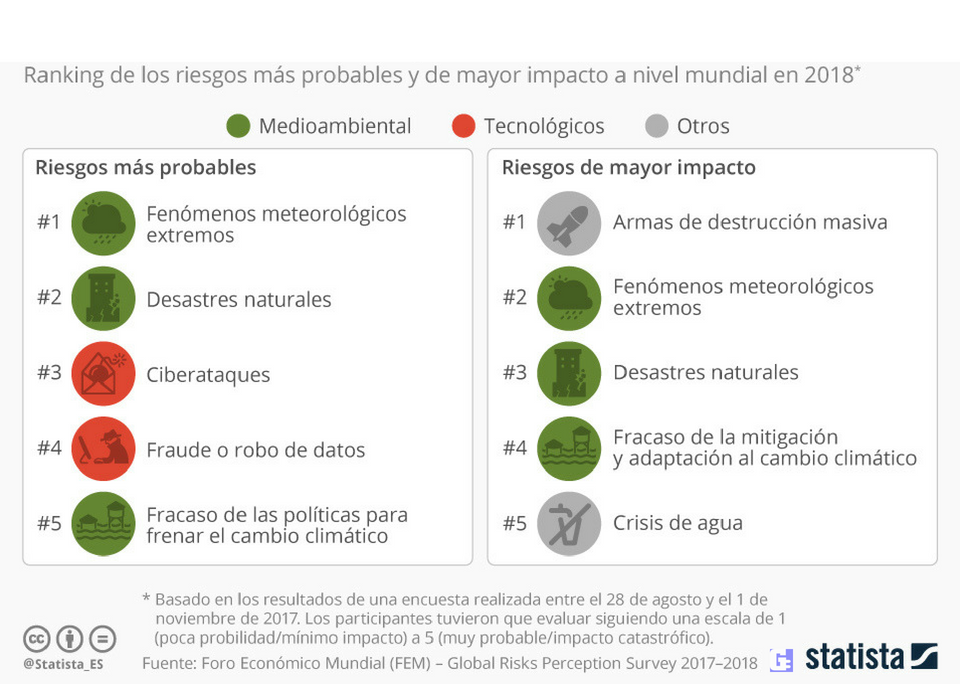 Como muestra esta infografía de Statista, los riesgos de carácter medioambiental destacan sobre el resto. Concretamente, los fenómenos meteorológicos extremos lideraron la clasificación en términos de probabilidad y ocuparon la segunda si se considera su futuro impacto social y económico. Los desastres naturales y el fracaso de las políticas para mitigar los efectos del cambio climático también se hicieron un hueco entre los cinco principales riesgos globales para el año que acaba de empezar.