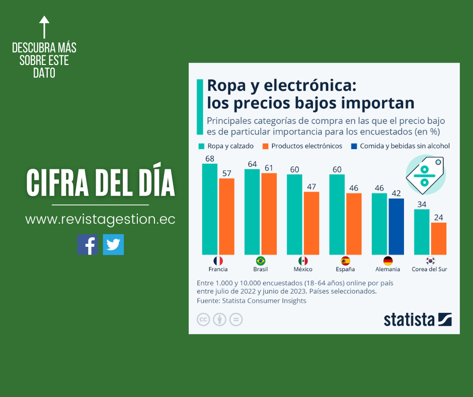 La ropa, el calzado y la electrónica de consumo son las principales categorías de productos en las que los precios bajos tienen particular importancia para los consumidores de los países seleccionados para el gráfico, de acuerdo con datos de Statista Consumer Insights. La indumentaria y el calzado inspiraron la mayor preocupación por el precio en cinco de los seis países analizados. Francia y Brasil muestran el porcentaje más alto de encuestados que valoran los precios bajos en ropa y calzado, con un 68% y un 64%, respectivamente.