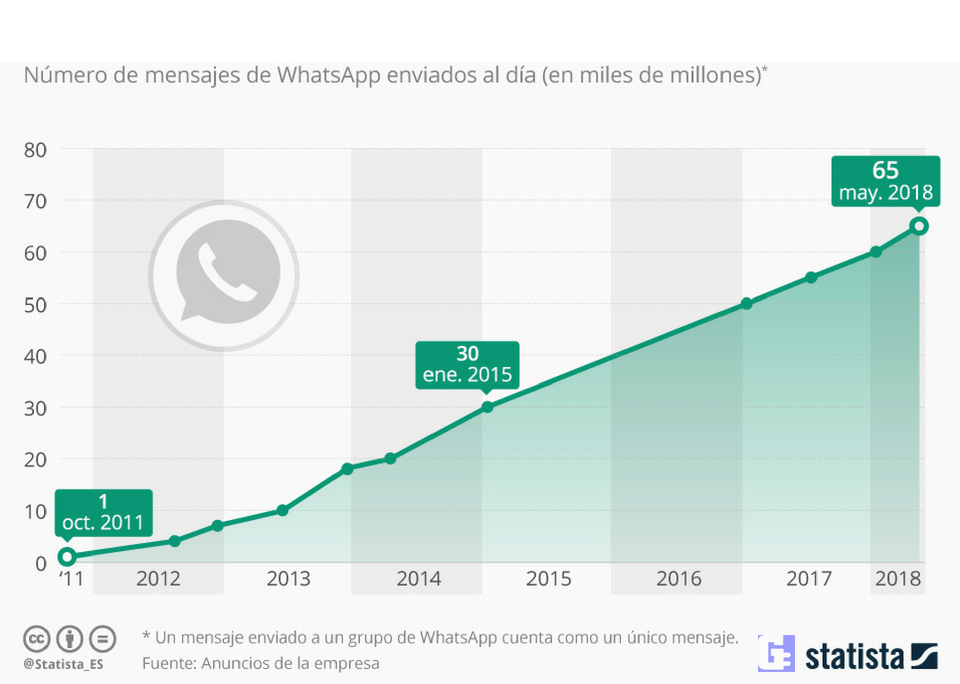 A nivel global, además, más de 1.500 millones de personas usan esta aplicación al menos una vez al mes, lo que la convierte en la plataforma en envío de mensajes instantáneos más utilizada del mundo. Esto se traduce, según datos publicados recientemente por Facebook (empresa dueña de la plataforma), en un intercambio global de alrededor de 65.000 millones de mensajes al día. Revise esta infografía de Statista: