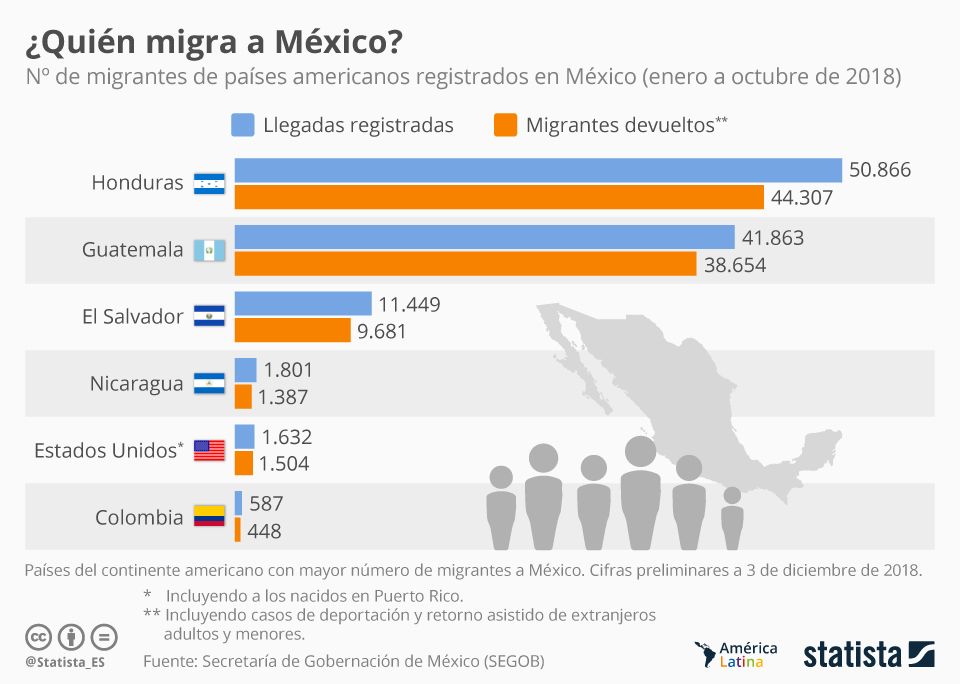 En total, la SEGOB registró alrededor de 118.300 llegadas de inmigrantes a México y más de 96.600 deportaciones o retornos asistidos a sus países de origen entre enero y octubre de 2018. Como indica el siguiente gráfico de Statista, Honduras y Guatemala encabezan la lista de países tanto en el número de llegadas como en la cantidad de migrantes devueltos desde México. En 2018, cerca de 50.900 migrantes que se presentaron ante las autoridades migratorias mexicanas fueron ciudadanos hondureños y 41.900, guatemaltecos. A su vez, más de 44.300 fueron deportados o asistidos en su vuelta a Honduras y casi 38.700, a Guatemala.