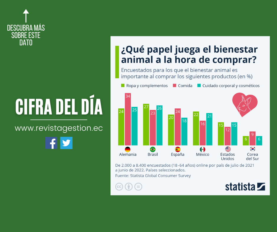 Sería el caso de una parte nada desdeñable de los compradores alemanes y brasileños encuestados por Statista y, en menor medida, de los españoles y mexicanos. Sin embargo, los participantes en el estudio de Estados Unidos y en especial de Corea del Sur parecen no poner en primer lugar el bienestar animal cuando van al supermercado.