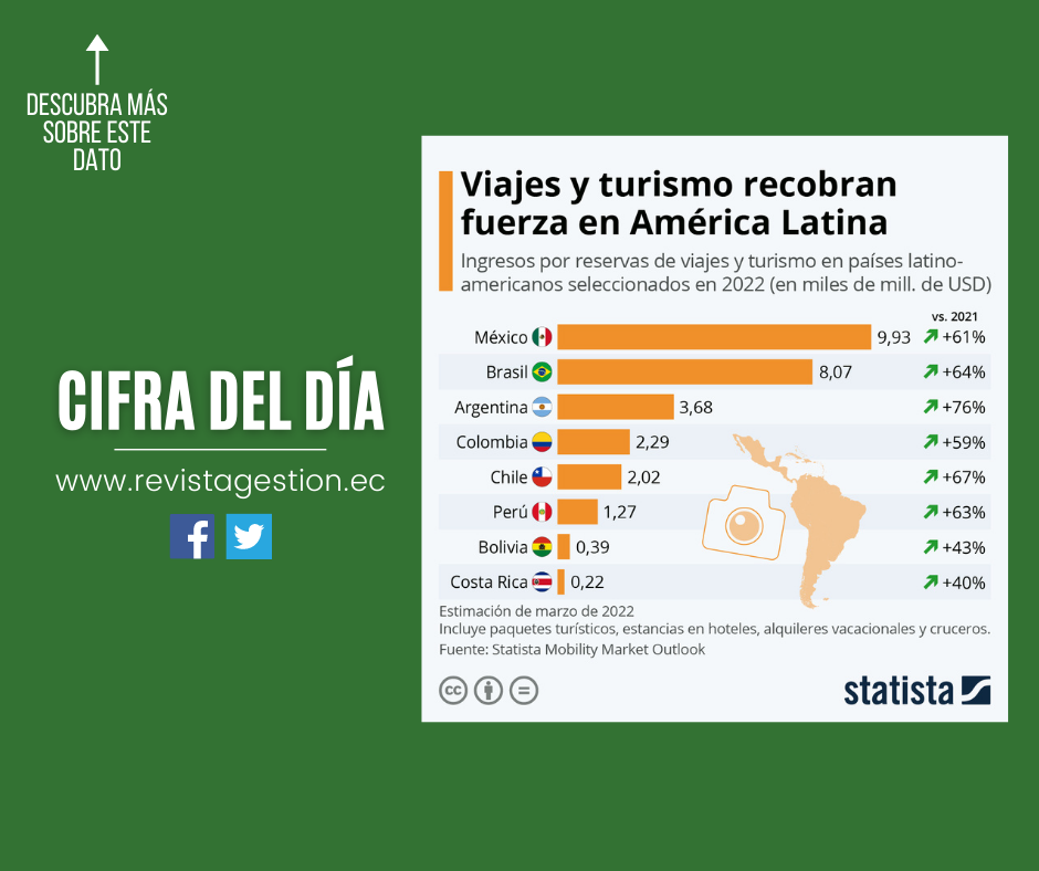 Pese a permanecer por debajo de los niveles anteriores a la crisis, de acuerdo con el Statista Mobility Market Outlook, los ingresos en el mercado de los viajes y el turismo aumentarían en más del 60% en América Latina y el Caribe en 2022. En México, se prevé que los ingresos procedentes de reservaciones de cruceros, hoteles, alquileres vacacionales y paquetes turísticos asciendan a unos 10.000 millones de dólares estadounidenses, frente a los 6.200 millones de dólares el año anterior.