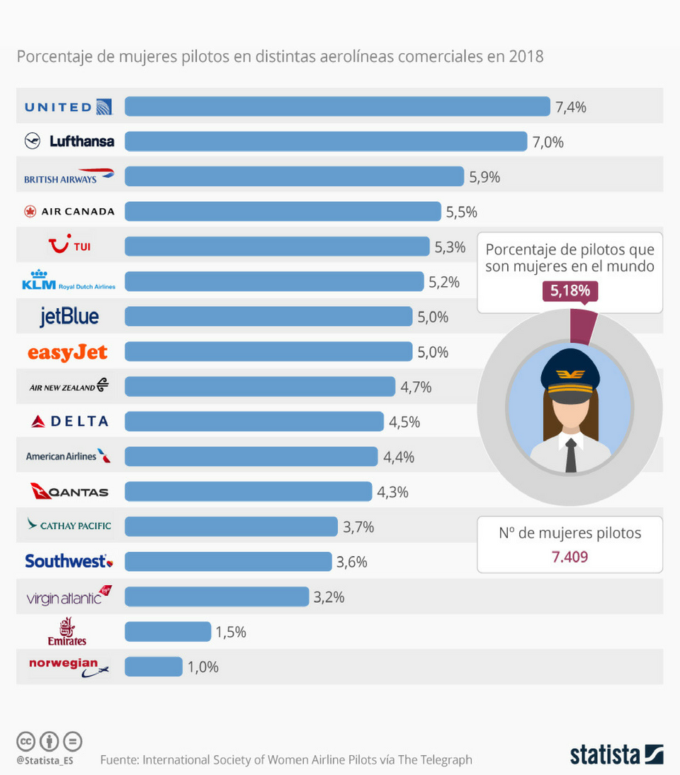 Tal y como muestra este gráfico de Statista, solo el 5,2% de las pilotos empleadas en las aerolíneas comerciales en todo el mundo son mujeres. Incluso, en algunas, como Emirates y Norwegian, este ratio se reduce a menos del 2%, según datos del la International Society of Women Airline Pilots vía The Telegraph recogidos por The Telegraph.