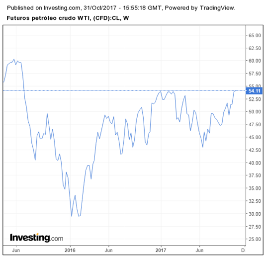 El precio del petróleo WTI alcanzó el mayor precio desde julio de 2015, llegando a $ 54 por barril. Una buena noticia para que el déficit del sector público tenga una menor carga en términos de ajuste y endeudamiento, así como para que se obtenga una balanza comercial positiva.