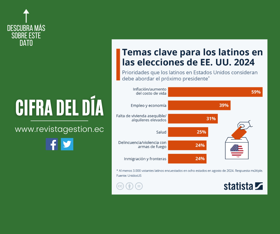 Pero ¿cuáles son los temas que los latinos consideran prioritarios para el próximo presidente? Según los resultados de la Encuesta Nacional de Votantes Latinos realizada por UnidosUS en agosto de 2024, las preocupaciones económicas encabezan la lista para esta población de cara a las elecciones estadounidenses de 2024. La inflación y el aumento del costo de vida fueron identificados como las principales inquietudes por más de la mitad de los encuestados, seguidos por el empleo y la economía, citados por el 39% de los encuestados.