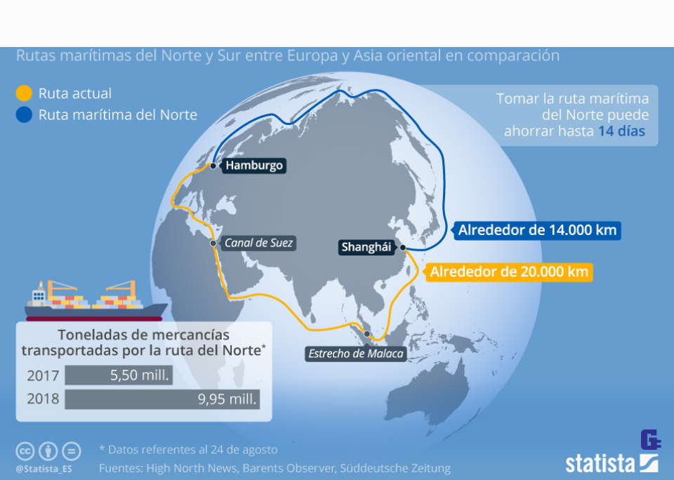 El primer buque portacontenedores que atraviesa la ruta marítima del Norte (pasando por el océano Ártico) debería alcanzar en pocos días la ciudad de San Petersburgo, destino del viaje. Esta travesía, que plantea una alternativa al recorrido a través del Canal de Suez para viajar de Europa a Asia y es viable gracias al derretimiento del hielo polar, es una opción cada vez más atractiva para muchas compañías navieras. Así, tal y como muestra este gráfico de Statista, mientras que en 2017 solo 5,5 millones de toneladas de mercancías fueron transportadas a través del la Ruta marítima del Norte hasta el 24 de agosto, este año esta cifra ya asciende a los 9,95 millones de toneladas, casi el doble.
