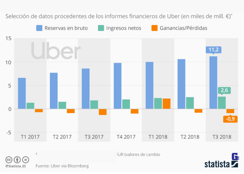 Tal y como muestra este gráfico de Statista, Uber todavía no ha conseguido convertirse en una empresa con beneficios. En el tercer trimestre de este año, por ejemplo, esta registró unas pérdidas de 1.100 millones de dólares estadounidenses (900 millones de euros), según informa Bloomberg. Esta no será ni mucho menos la primera compañía tecnológica que se convierte en pública (nomenclatura equivalente a anónima en países de habla hispana) antes de ser rentable, sino que este también fue el caso de otras como Spotify y Snapchat.