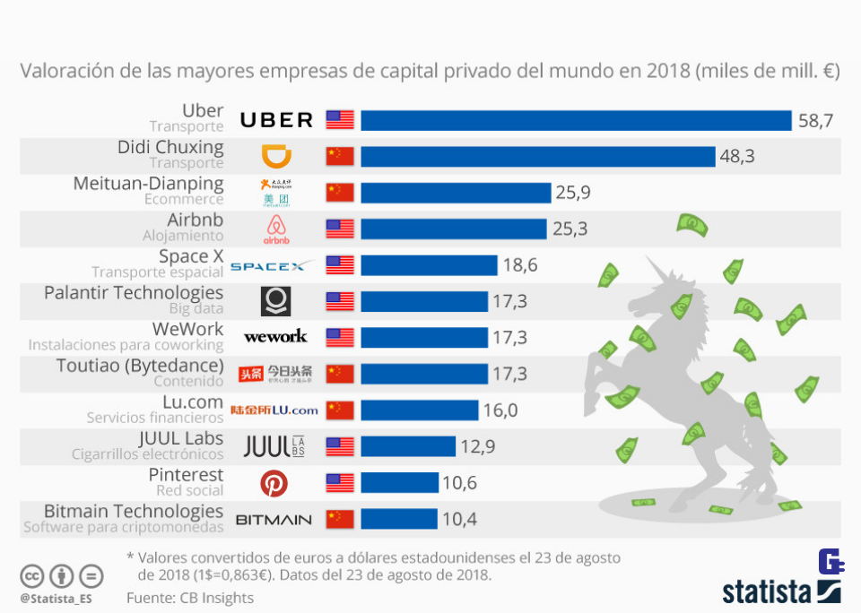 Tal y como muestra este gráfico de Statista, en la actualidad las empresas unicornio de mayor valor son las que gestionan las plataformas de transporte Uber y su homóloga china, Didi, con 58,7 millones de euros y 48,3 millones respectivamente.