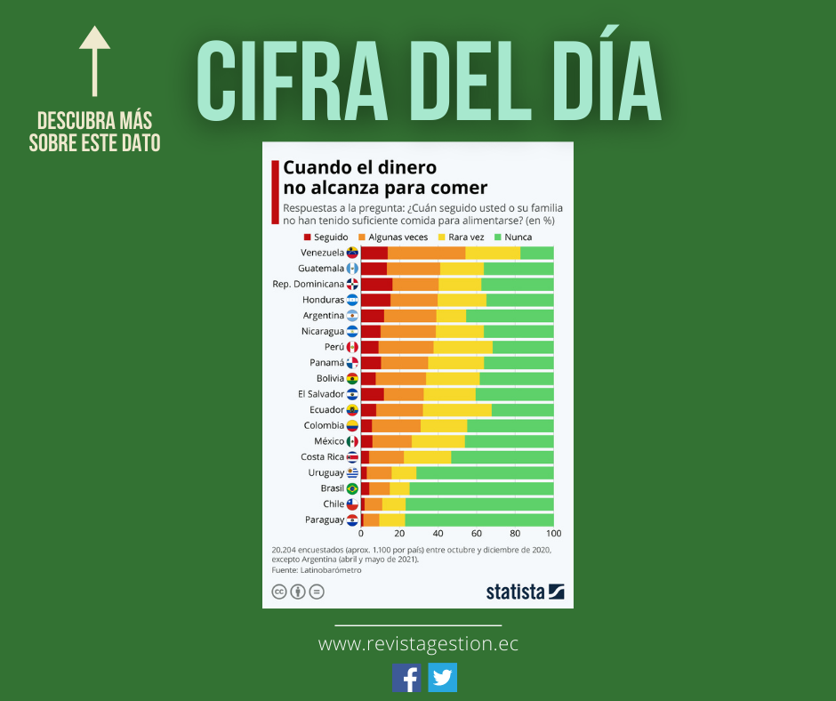 En Venezuela, más de la mitad de las personas entrevistadas (un 54%) afirma que esto le sucede frecuentemente o a veces, el mayor porcentaje de los 18 países analizados en la región. Tan solo un 17% de los venezolanos encuestados dice no tener nunca dificultades para alimentarse. República Dominicana también obtuvo uno de los peores resultados en este sentido, con al menos un 16% de las respuestas afirmando no tener suficiente comida frecuentemente. En tanto, la falta de dinero u otros medios para comprar comida es un problema para una minoría de encuestados en Paraguay, Chile, Brasil y Uruguay, donde más del 70% dice no encontrarse nunca en esta situación.