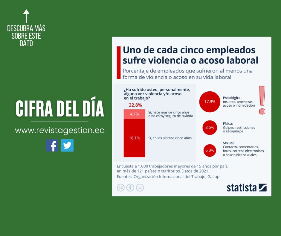 Uno de cada cinco empleados ha sufrido al menos una modalidad de violencia o acoso durante su vida laboral, según un informe de la Organización Internacional del Trabajo y Gallup. Más de tres de cada cinco víctimas de violencia y acoso en el trabajo aseguran haberlo sufrido varias veces y, para la mayoría, el incidente más reciente sucedió en los últimos cinco años.