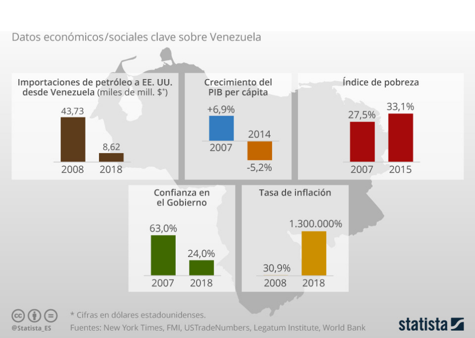Según datos del Fondo Monetario Internacional, entre 2012 y 2017 Venezuela ha perdido el 37% de su Producto Interior Bruto pasando de tener este un valor de casi 332.000 millones de dólares estadounidenses a 211.000 millones. Una de las principales razones de esta caída abrupta ha sido la depreciación del petróleo, del que su economía es fuertemente dependiente.