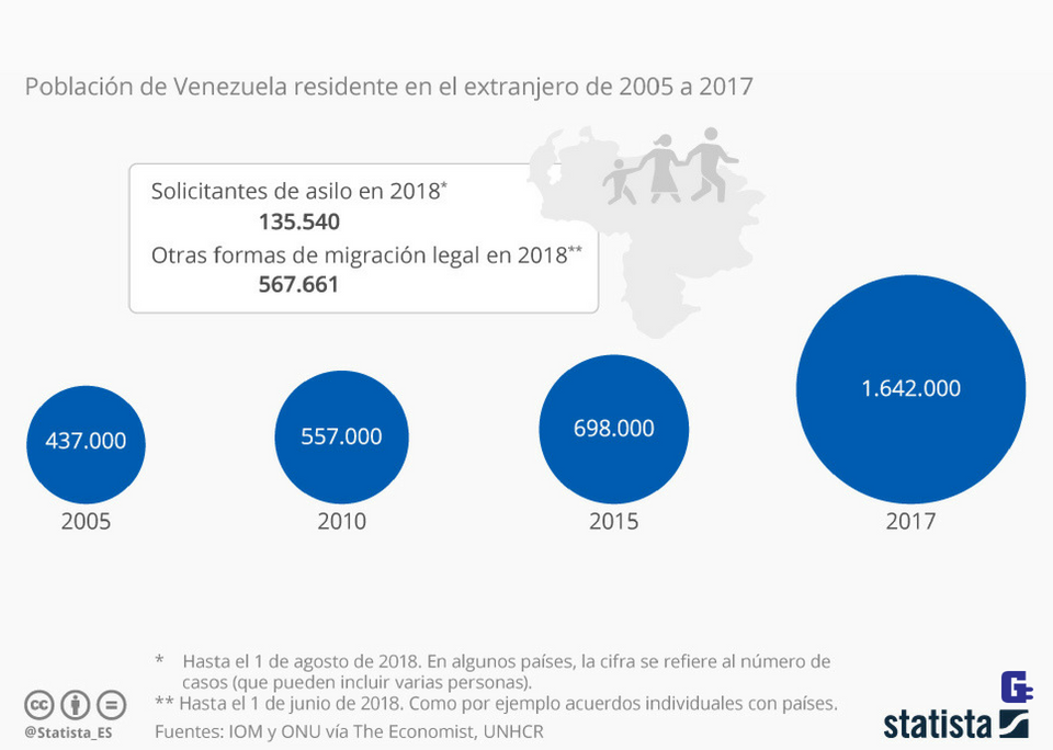 La profunda crisis económica y social de Venezuela, conocida internacionalmente por la salvaje hiperinflación del país, está llevando a cientos de miles de venezolanos a emigrar a otros países, especialmente situados en el continente americano. De este modo, estos están tratando de ser admitidos en países como Perú, Estados Unidos, Brasil, Ecuador, Colombia, Chile o Argentina, entre otros, dando lugar a uno de los mayores flujos migratorios de los últimos años.
