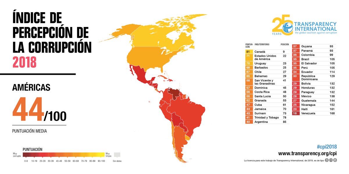 Según el Índice de Percepción de la Corrupción, publicado por la ONG Transparencia Internacional, Venezuela y Nicaragua son los países que más padecen de este mal en la región, mientras que Uruguay y Chile sobresalen por sus bajos niveles.