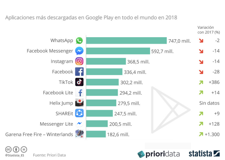 WhatsApp fue el año pasado la aplicación de Google Play con una mayor demanda a nivel mundial, con 747 millones de descargas. Esta cifra se mantuvo prácticamente constante respecto al año anterior, con un ligero descenso del 2%. La siguiente aplicación preferida fue otro servicio de mensajería, Facebook Messenger, descargada de la plataforma de Google 593 millones de veces.