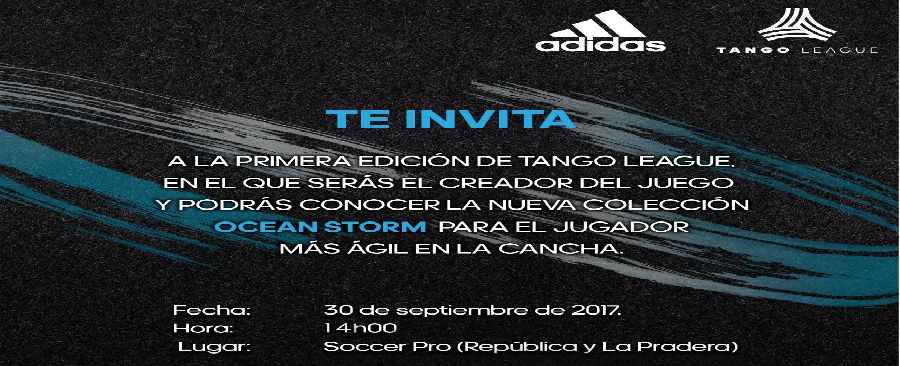 El evento “Tango League” en su primera edición con el más reciente lanzamiento de la campaña Ocean Storm de Adidas fútbol; es una ocasión que reúne a 112 jugadores entre 16 a 25 años, quienes han sido seleccionados entre colegios y universidades de la ciudad por su gran desempeño en este deporte de transcendencia a nivel local. Tango League es un campeonato que se llevará a cabo a partir de las 08:00 hasta las 16:00 del día sábado 30 de septiembre con una serie de partidos (5 vs 5) hasta llegar a una final con un equipo ganador y un jugador “All Stars” quien será auspiciando por la marca con producto fútbol hasta fin de año. El evento durará 8 horas de campeonato.