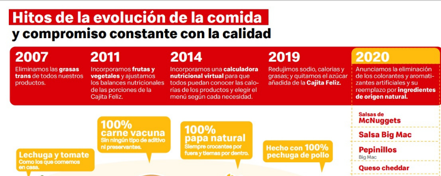 De esta forma, implementó la remoción de los colorantes y aromatizantes artificiales en ingredientes como queso cheddar, salsa Big Mac, kétchup, mostaza, helado de vainilla, entre otros. Todos los cambios impactan directamente en productos de la compañía como las hamburguesas, entre ellas la Big Mac y el Cuarto de Libra; así como también en otros integrantes de su menú como los McNuggets 100% pollo y sus respectivas salsas.