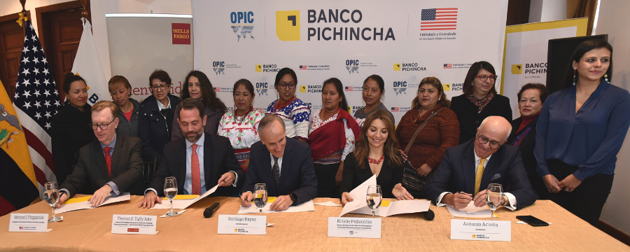 Banco Pichincha firmó un acuerdo con la Corporación de Inversión Privada en el Extranjero (OPIC, por sus siglas en inglés) para un préstamo de $ 100 millones, junto con un financiamiento adicional de $ 8,5 millones del Banco Wells Fargo. Su alianza respaldará los préstamos a micro, pequeñas y medianas empresas (MIPYME) en Ecuador que son propiedad de, lideradas por, o que apoyan a mujeres.
