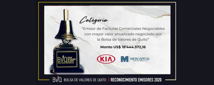 La Bolsa de Valores de Quito reconoció a Aekia S.A., representante de Kia Motors en Ecuador por su excelente desempeño en el mercado de valores, otorgándole el premio al primer lugar como Emisor de Facturas Comerciales Negociables (FCN) con mayor valor anualizado negociado en el 2020. Así como por su magnífica presencia bursátil, cumplimiento perfecto a sus inversionistas.