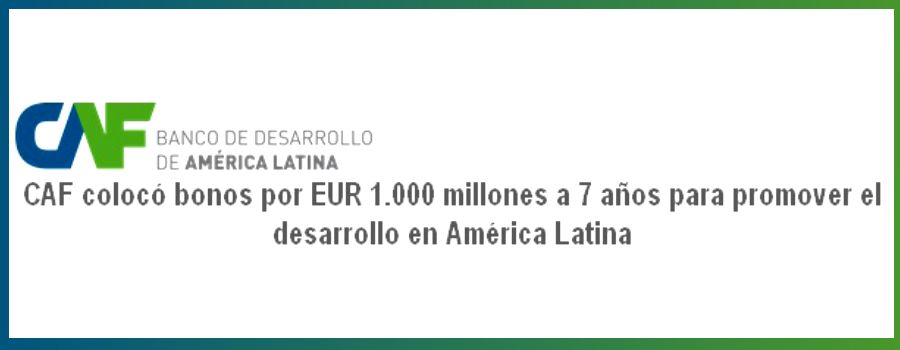 CAF -banco de desarrollo de América Latina- emitió hoy un bono de tamaño "benchmark" en Europa a un plazo de 7 años y un cupón de 1,125% por un monto total de EUR 1.000 millones. La demanda de los inversionistas sobrepasó los EUR 1.200 millones, sin duda una buena noticia en medio de la volatilidad registrada en los mercados de capitales. Los principales inversionistas que demandaron los bonos fueron administradores de fondos, bancos, instituciones públicas y bancos centrales, y aseguradoras, entre otros, provenientes de Europa, Estados Unidos y Asia. Los bancos colocadores fueron BBVA, Credit Agricole y HSBC.