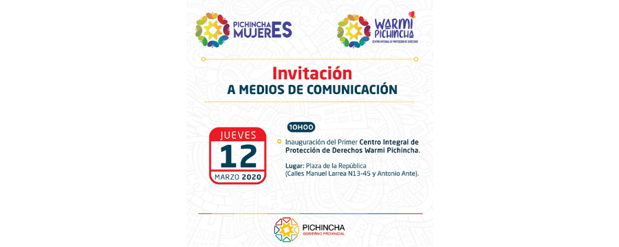 Pichincha Mujeres invita a la inauguración de el Centro de Protección Integral de Derechos "Warmi Pichincha". La creación de este Centro se realiza como acto subsecuente al Día Internacional de la Mujer, que se realizará el jueves 12 de marzo en la plaza de la República (Manuel Larrea y Ante, bajos del Consejo Provincial).